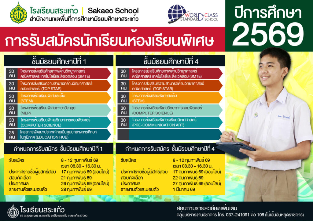 รับนักเรียนห้องเรียนพิเศษ ระดับชั้น มัธยมศึกษาปีที่ 1 และมัธยมศึกษาปีที่ 4