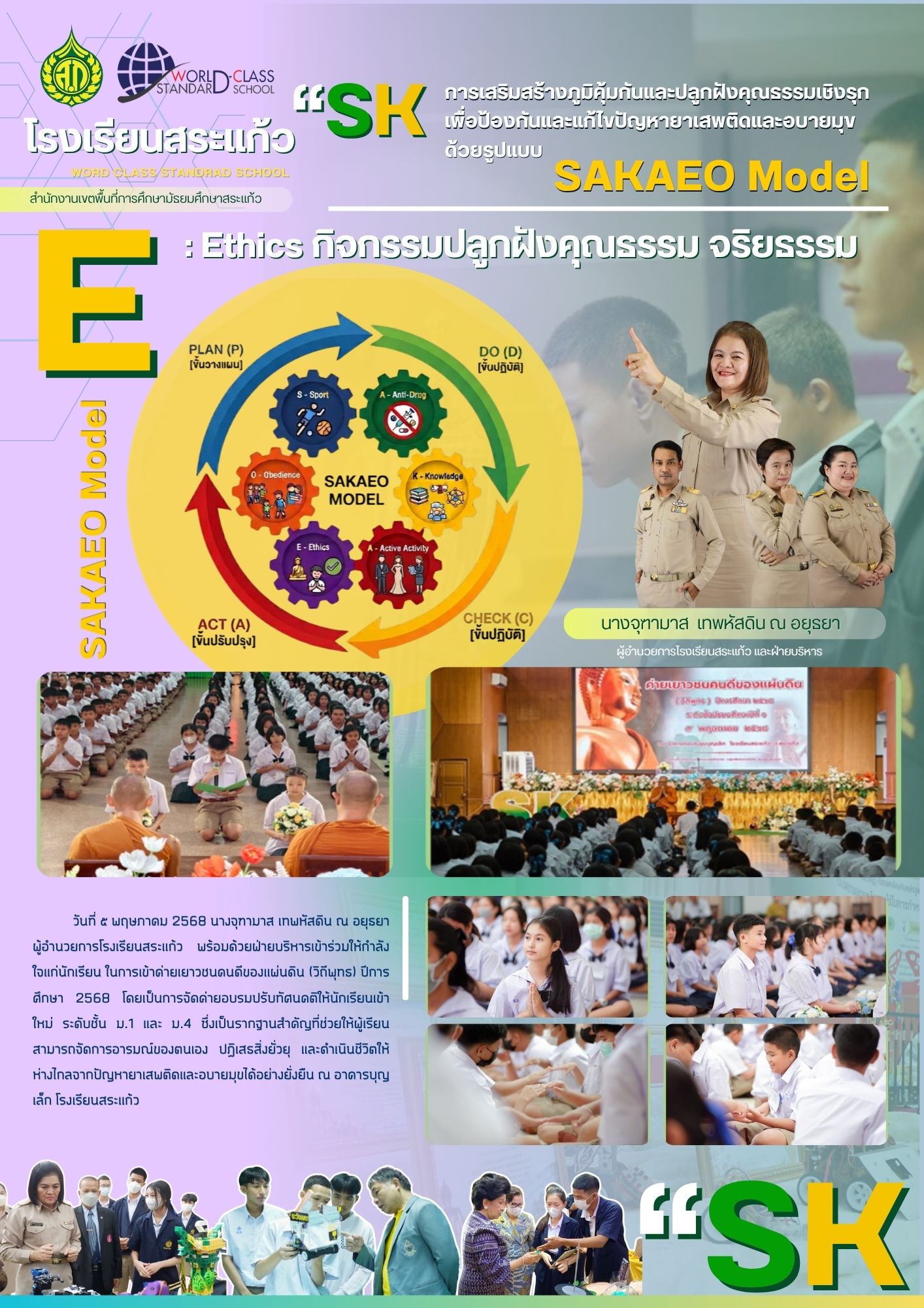 โดยเป็นการจัดค่ายอบรมปรับทัศนคติให้นักเรียนเข้าใหม่ ระดับชั้น ม.1 และ ม.4 ซึ่งเป็นรากฐานสำคัญที่ช่วยให้ผู้เรียนสามารถจัดการอารมณ์ของตนเอง ปฏิเสธสิ่งยั่วยุ และดำเนินชีวิตให้ห่างไกลจากปัญหายาเสพติดและอบายมุขได้อย่างยั่งยืน ณ อาคารบุญเล็ก โรงเรียนสระเเก้ว